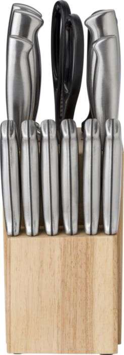 Set da cucina composto da 14 elementi in acciaio inox e polipropilene, ceppo in legno, composto da un paio di forbici, affilalama ed 11 diversi coltelli