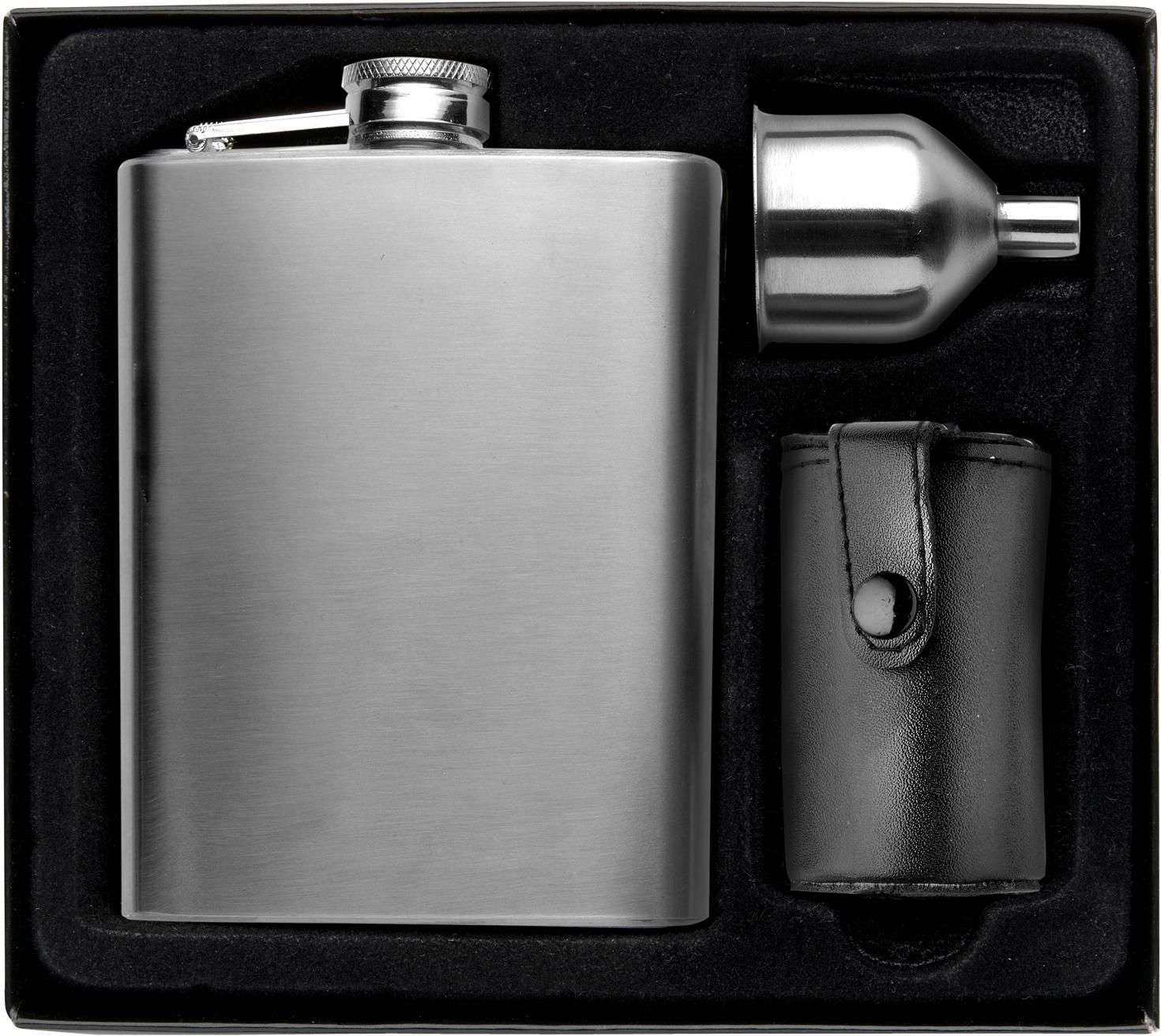 Set Fiaschetta, con quattro bicchierini 30 ml ed imbuto, in acciaio inox, capacità 220 ml, confezione regalo