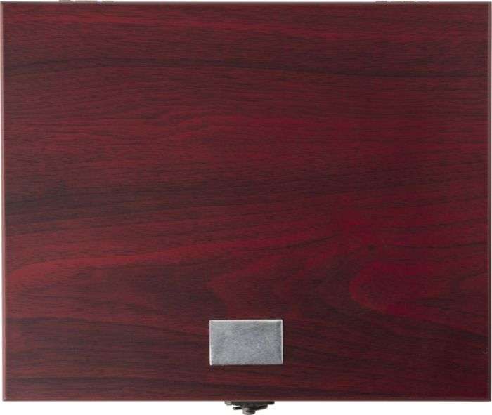 Set da vino in 9 accessori in acciaio inox, composto da due tappi per bottiglie, anello salvagoccia, beccuccio versatore, termometro, taglia-pellicola, imbuto e cavatappi, confezione regalo in legno