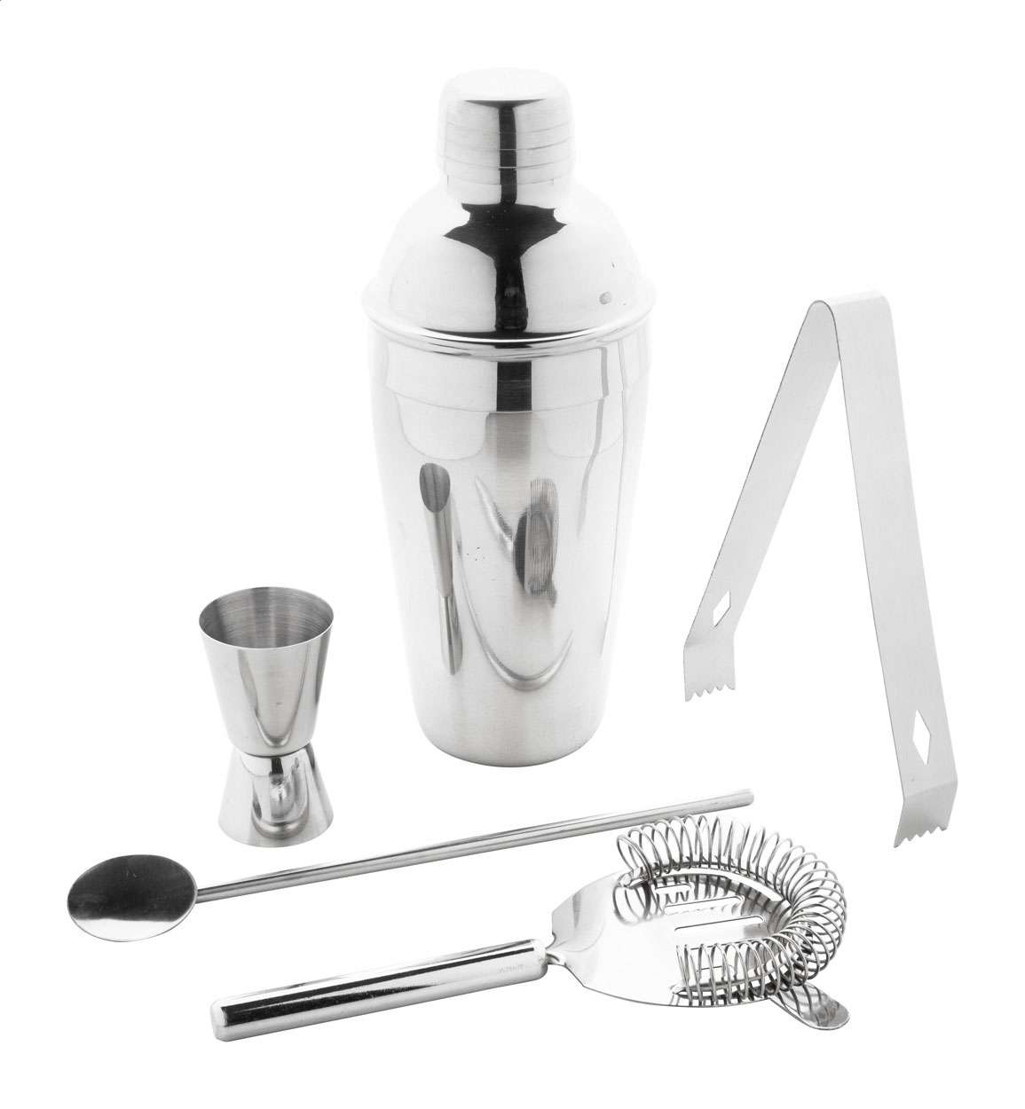 Set da cocktail composto da 5 pezzi in acciaio contenuti in una confezione di cartoncino kraft.Il set comprende: uno shaker per cocktail (550 ml), un jigger, un colino, un cucchiaio da bar e una pinza per il ghiaccio.