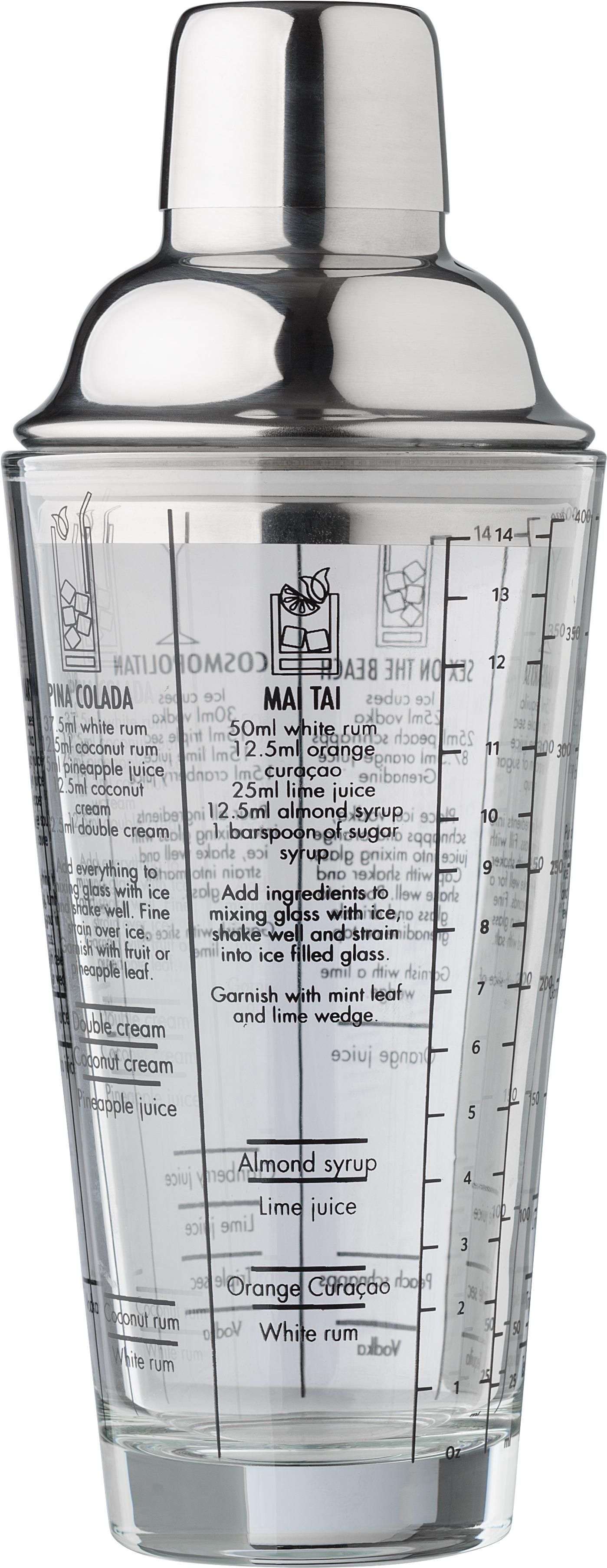 Shaker per cocktail in vetro, coperchio in acciaio inox 304, ricette dei cocktail stampate sul lato, confezionato singolarmente in una scatola di cartone avana, capacità 400 ml