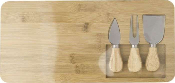 Tagliere per formaggi in bambù, incluso tre utensili inseriti nei tagli del tagliere, confezionati singolarmente in scatola di cartone marrone