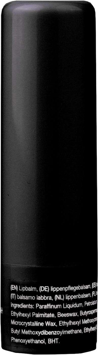 Balsamo per le labbra con protezione SPF 15, contenitore trasparente, i colori bianco, argento e nero hanno una finitura opaca.