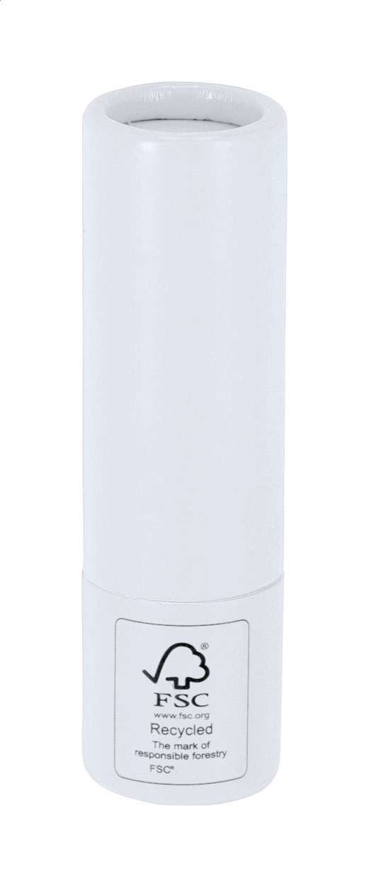 Balsamo per le labbra all'aroma di vaniglia contenuto in un supporto di carta riciclata, con protezione SPF15.