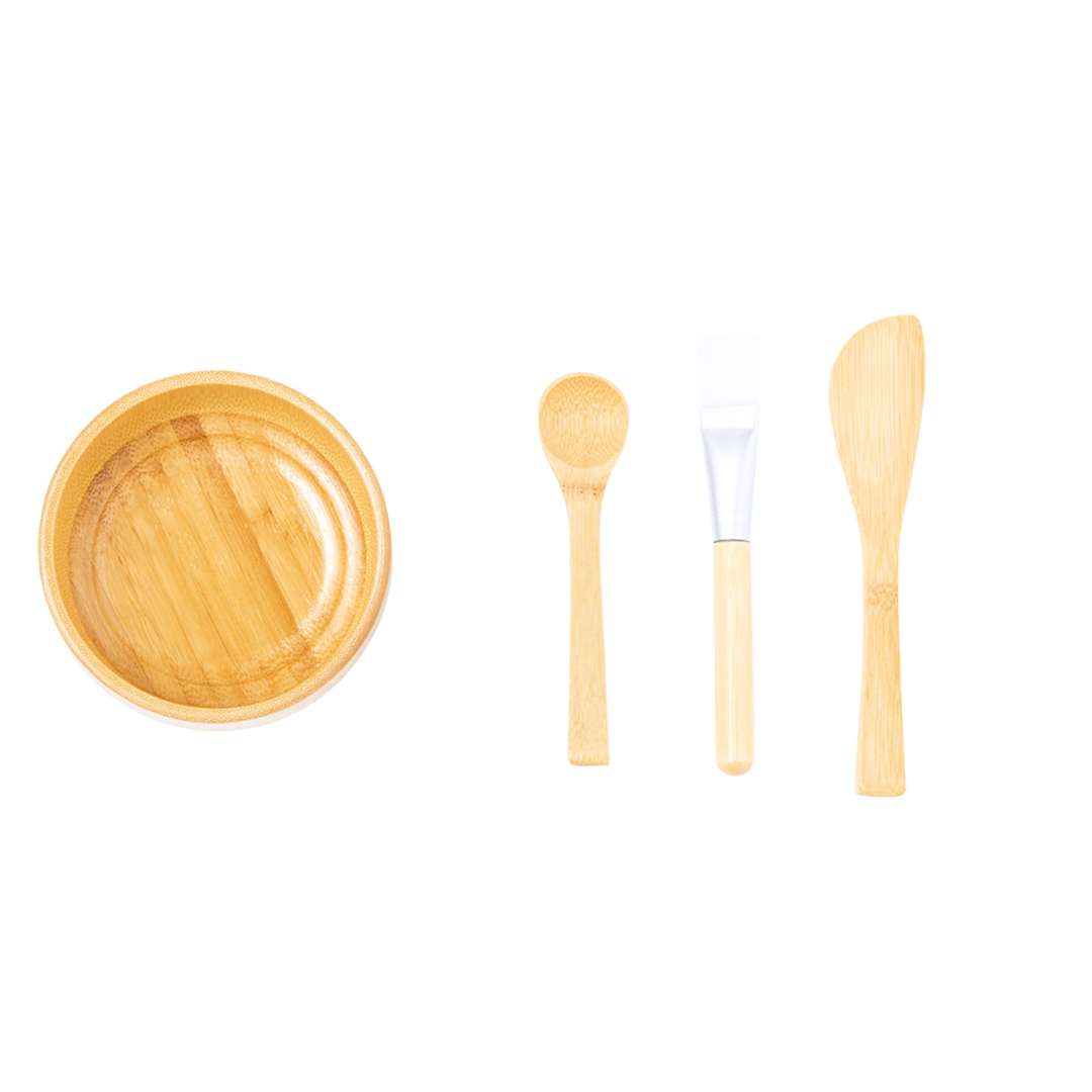 Set completo per maschere viso in bambù, ideale per una corretta applicazione della maschera viso. Composto da 4 pezzi: ciotola dal design elegante, cucchiaio, paletta e pennello a setole morbide. Facile da pulire e presentato singolarmente in una scatola dal design kraft.