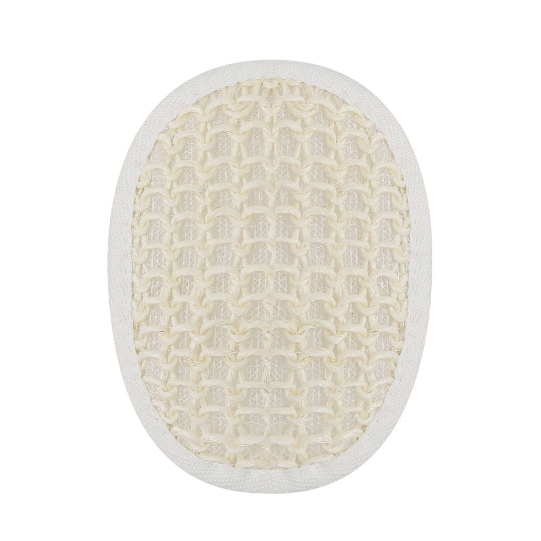 Spugna da bagno esfoliante in cotone adattabile al palmo della mano, con cinghia di tenuta abbinata.