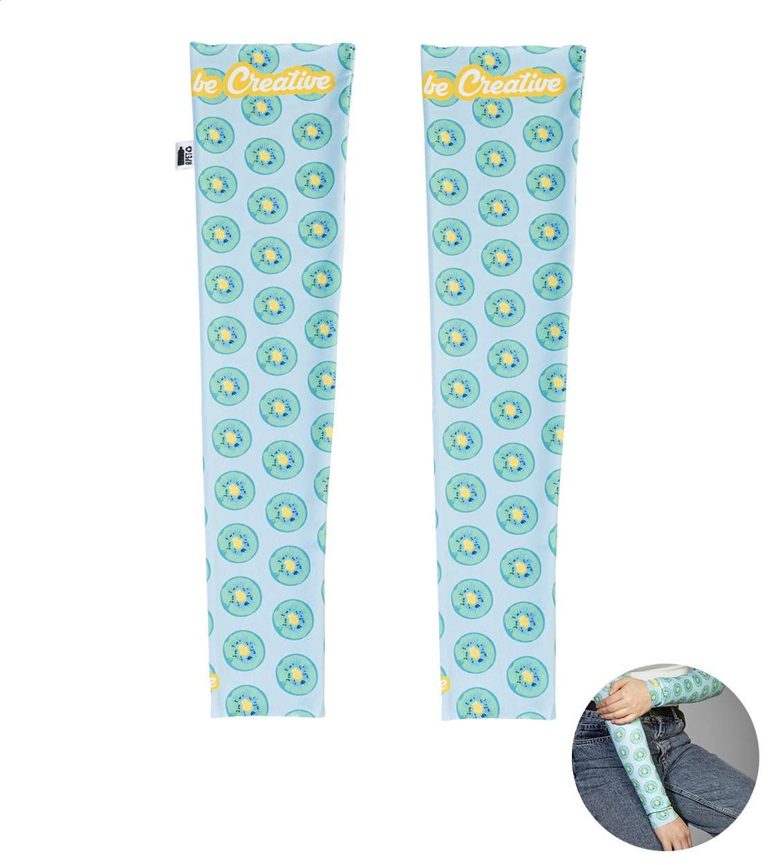 Coppia di manicotti elasticizzati in RPET personalizzati con grafica stampata in sublimazione su tutta la superficie ed etichetta RPET. 92% poliestere RPET e 8% elastan (185 g/m²). Quantità minima ordinabile: 50 pezzi. Taglie: M (8×12×48 cm), L (9,5×13,5×52 cm).