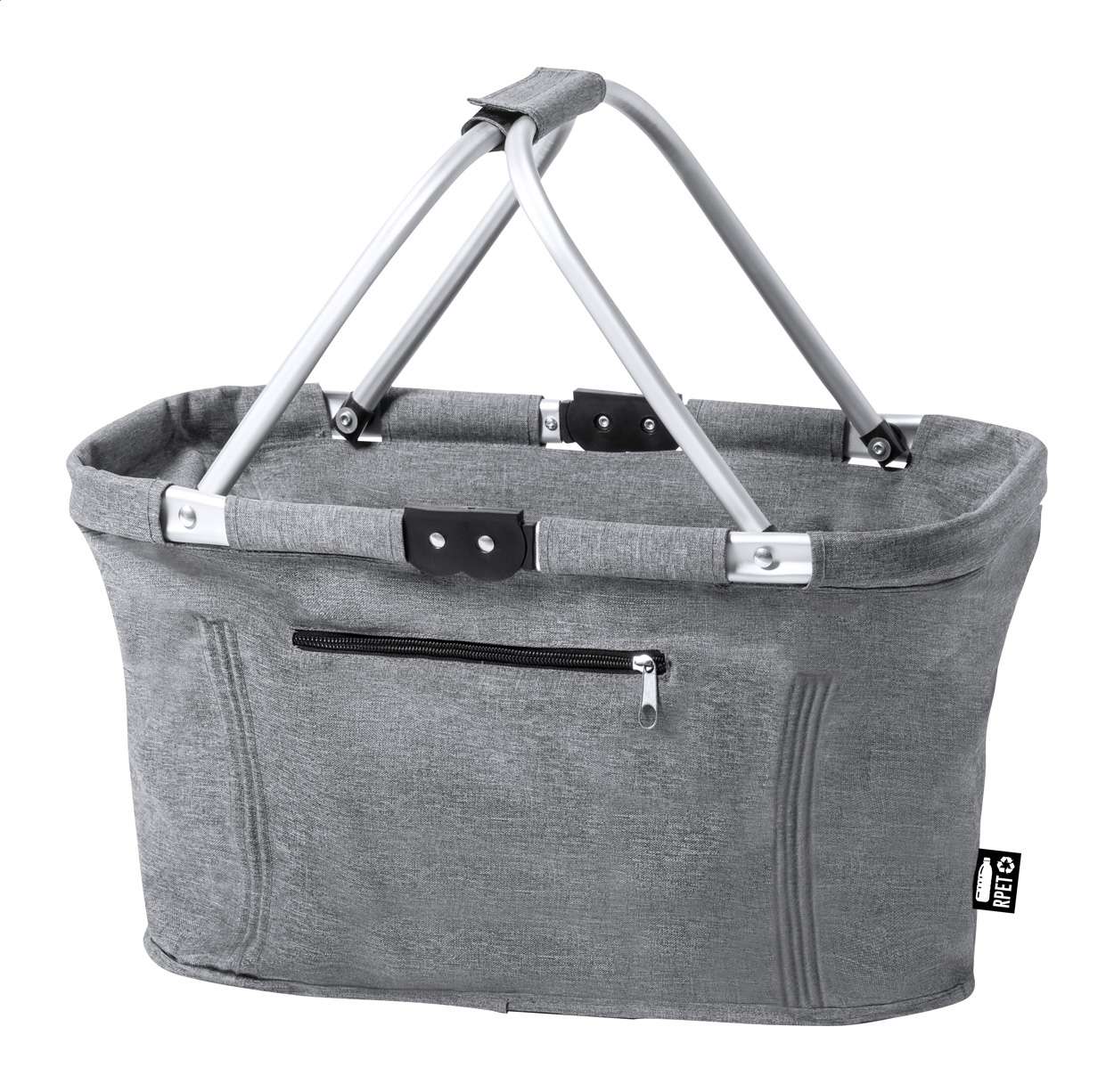 Cestino da picnic pieghevole in poliestere 600D RPET, con struttura in alluminio e tasca frontale con cerniera ed etichetta RPET.