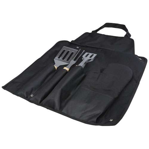 Set da barbecue composto da 5 pezzi: spatola (36,5 x 7 cm), forchettone (36,5 x 2 cm), pinza (36,5 x 5 cm), guanto (25 x 16 cm) e grembiule con custodia (42 x 60 cm). I manici sono realizzati in bambù ottenuto e prodotto in base a standard ecosostenibili.