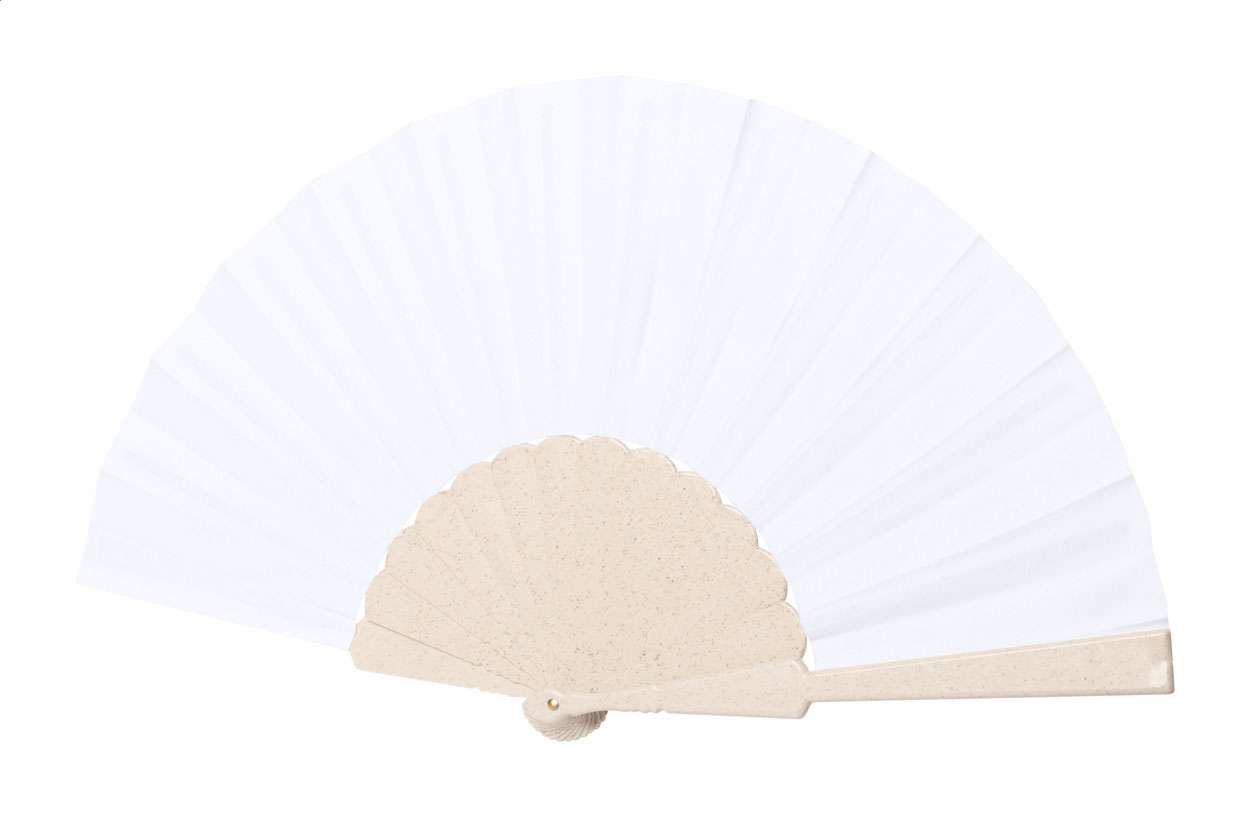 Ventaglio in poliestere RPET con stecche in fibra di bambù. Fornito in scatola di carta kraft.