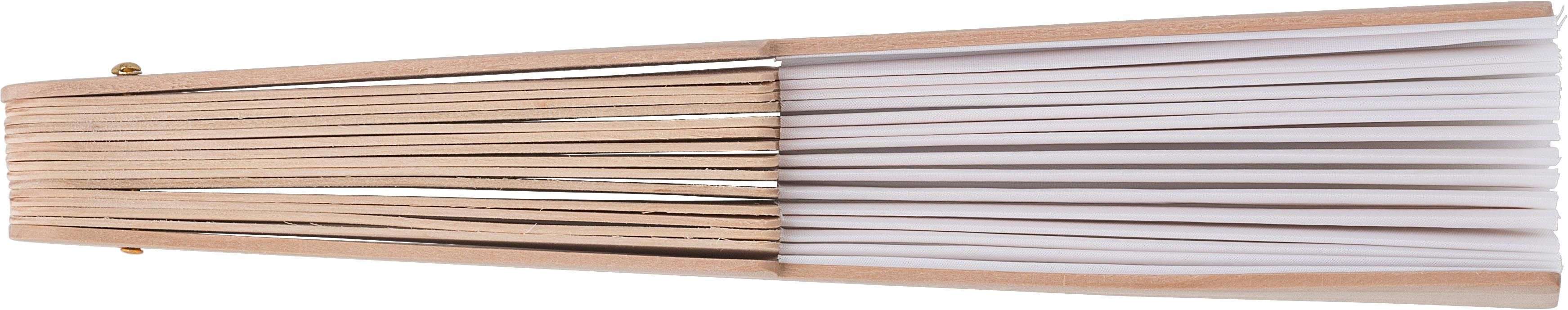 Ventaglio portatile in rPET con manico in legno, confezionato singolarmente in una scatola in cartone avana.
