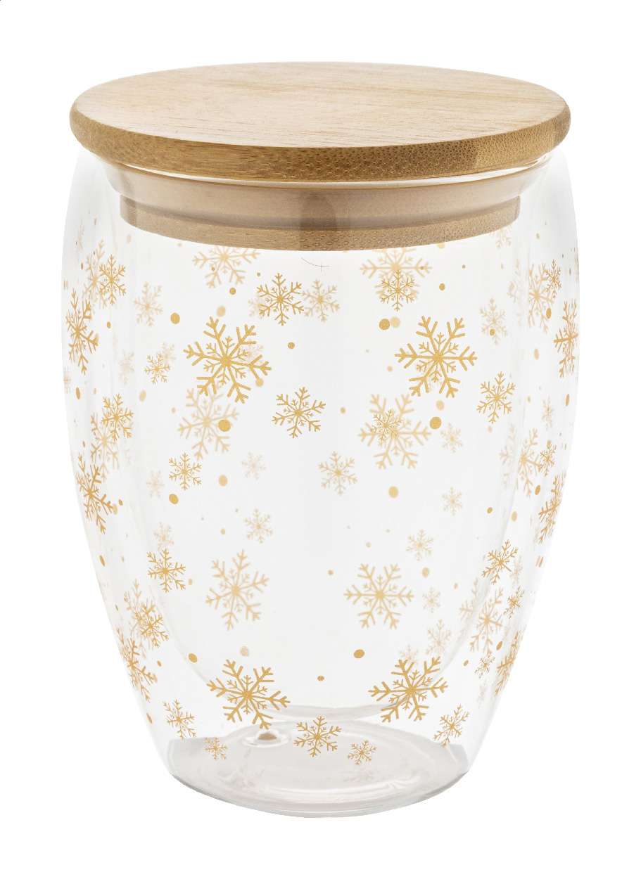 Barattolo in vetro borosilicato a doppia parete da 310ml. con decorazione fiocco di neve natalizio, tappo in bambù e confezione in scatola di cartoncino kraft.