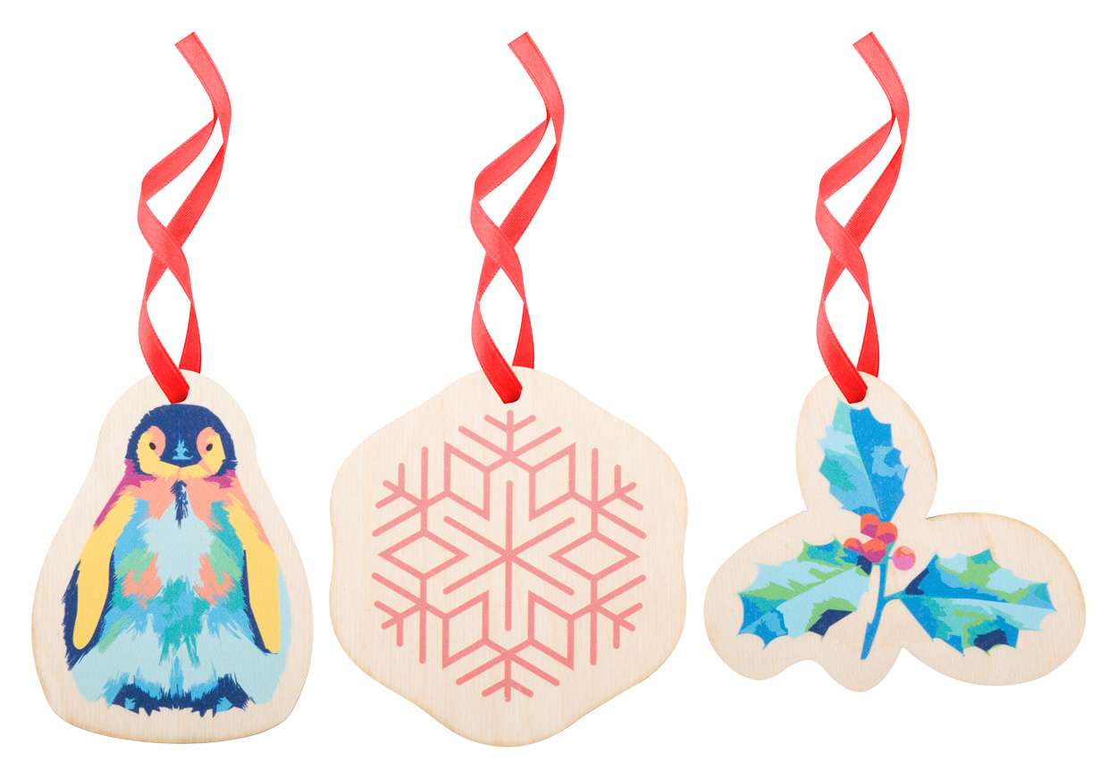 Decorazione per albero di Natale in compensato di betulla, con forma personalizzabile e grafica a colori. Dimensioni massime: 80x80 mm. Il prezzo include la stampa LED UV su un lato. Consegnato con nastro separato. MOQ: 100 pezzi.