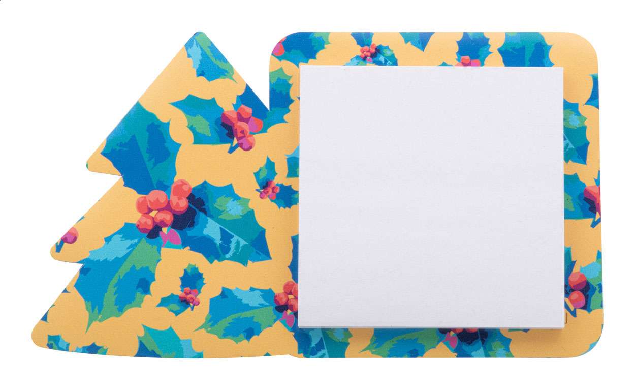 Magnete frigo a tema natalizio personalizzabile con blocchetto di 50 foglietti adesivi in carta riciclata (75×75 mm). MOQ: 100 pezzi.