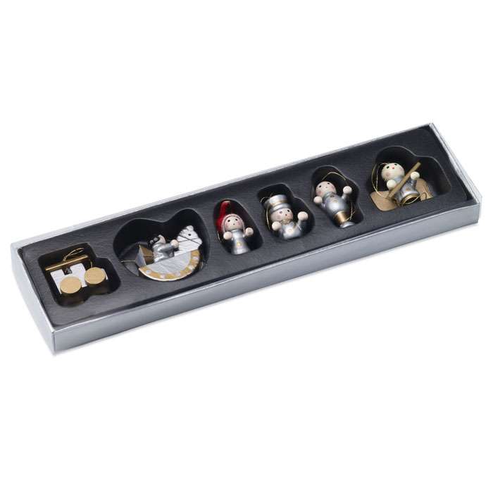 Set 6 decorazioni natalizie in legno in confezione di cartone con coperchio trasparente.