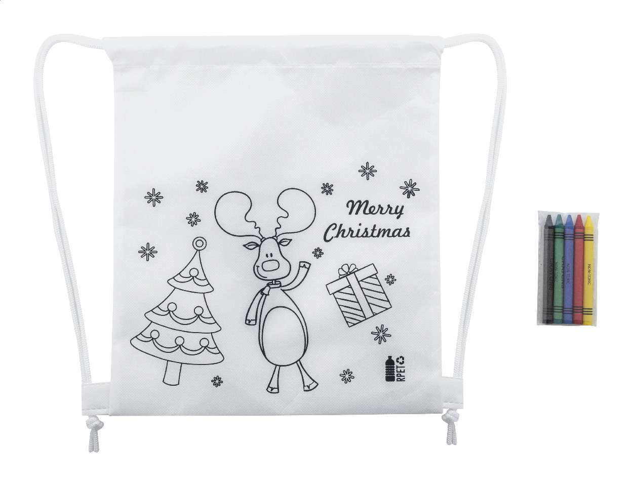 Sacca a tema natalizio da colorare in tessuto non tessuto RPET con 5 pastelli.