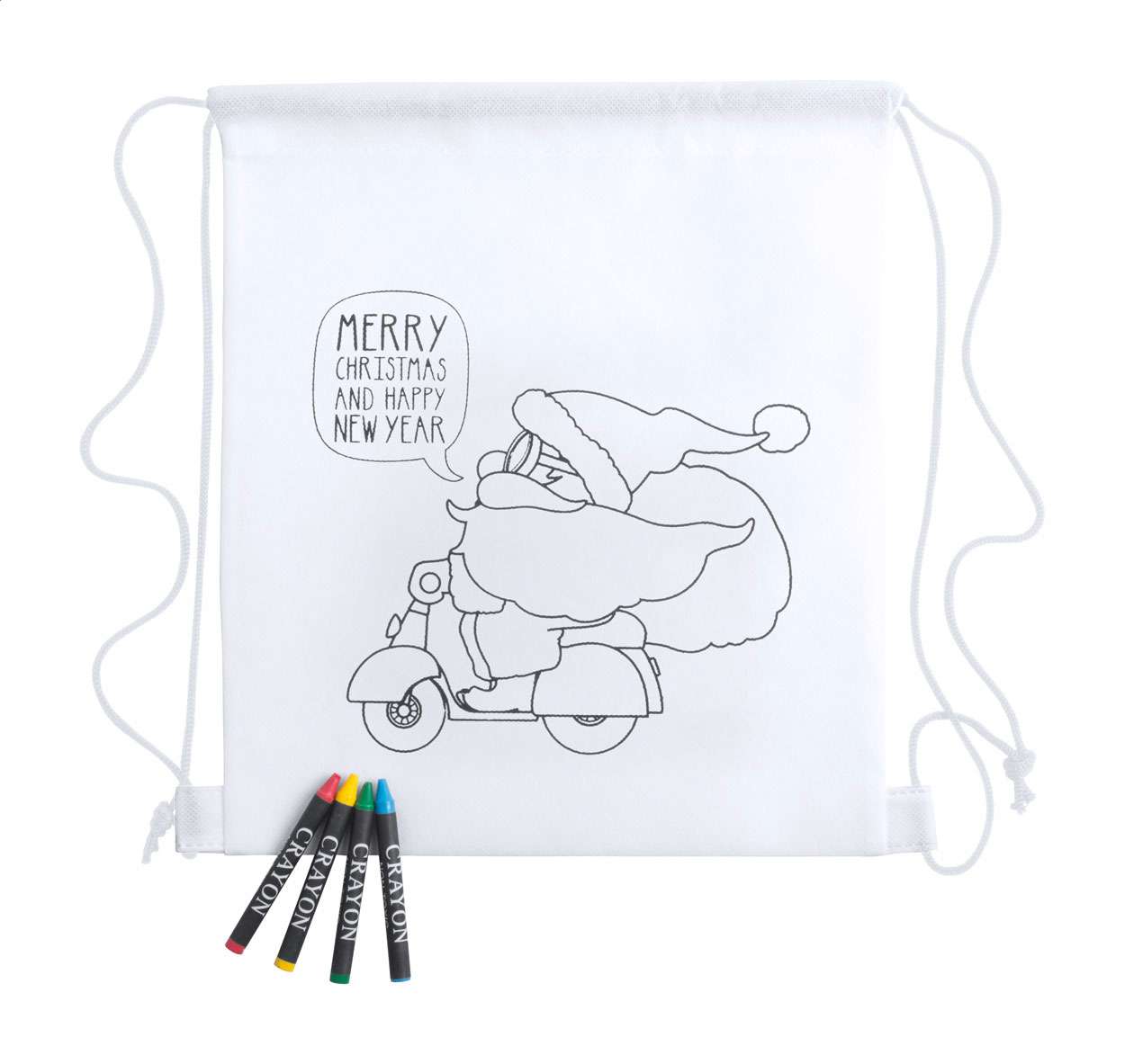 Sacca da colorare per bambini, in TNT 80 g/m². Inclusi 4 pastelli colorati.