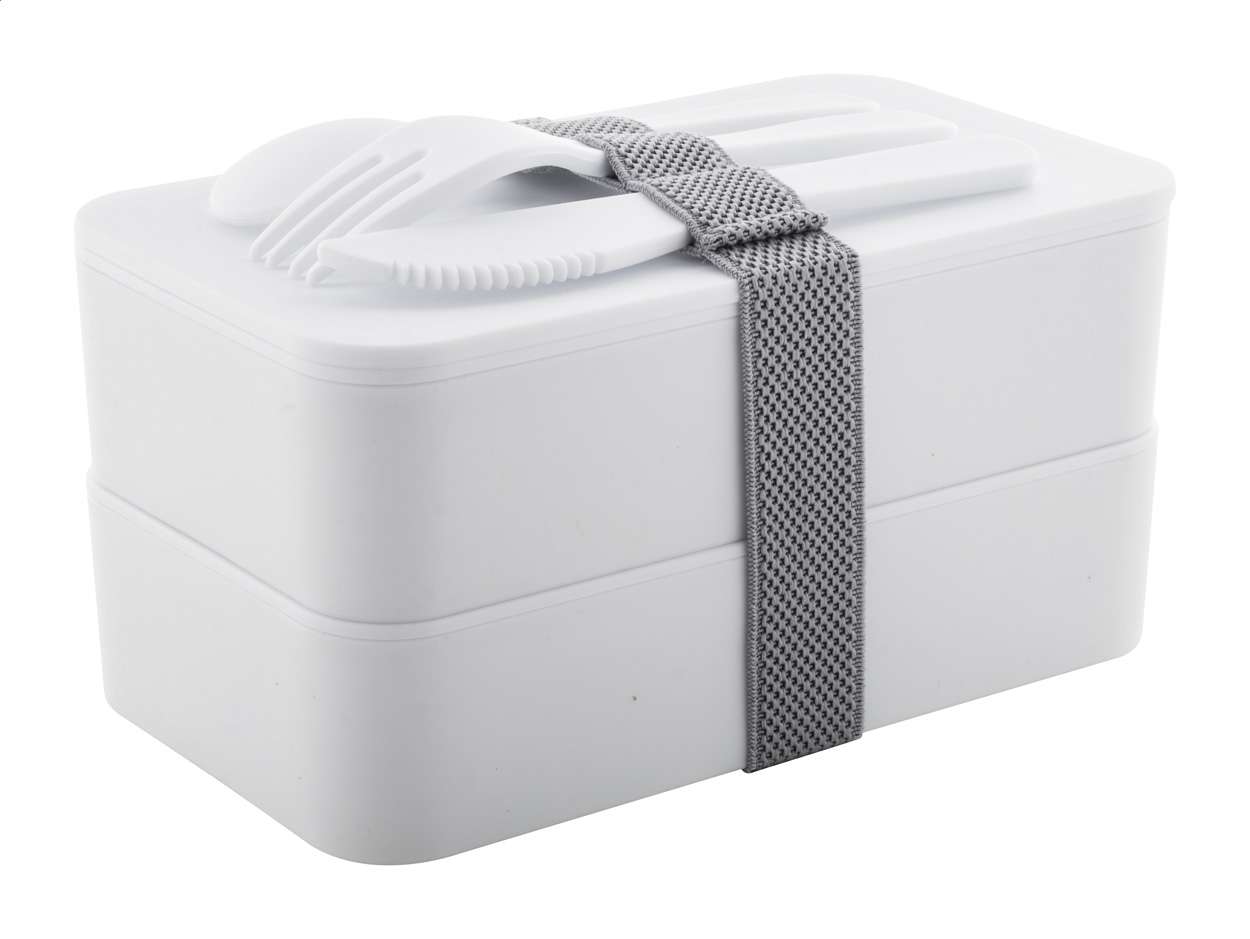 Contenitore per il pranzo in plastica antibatterica con set di posate (forchetta, cucchiaio e coltello), 2 scomparti da 700 ml ciascuno e fascia elastica di chiusura. Conforme alla normativa ISO 22196.