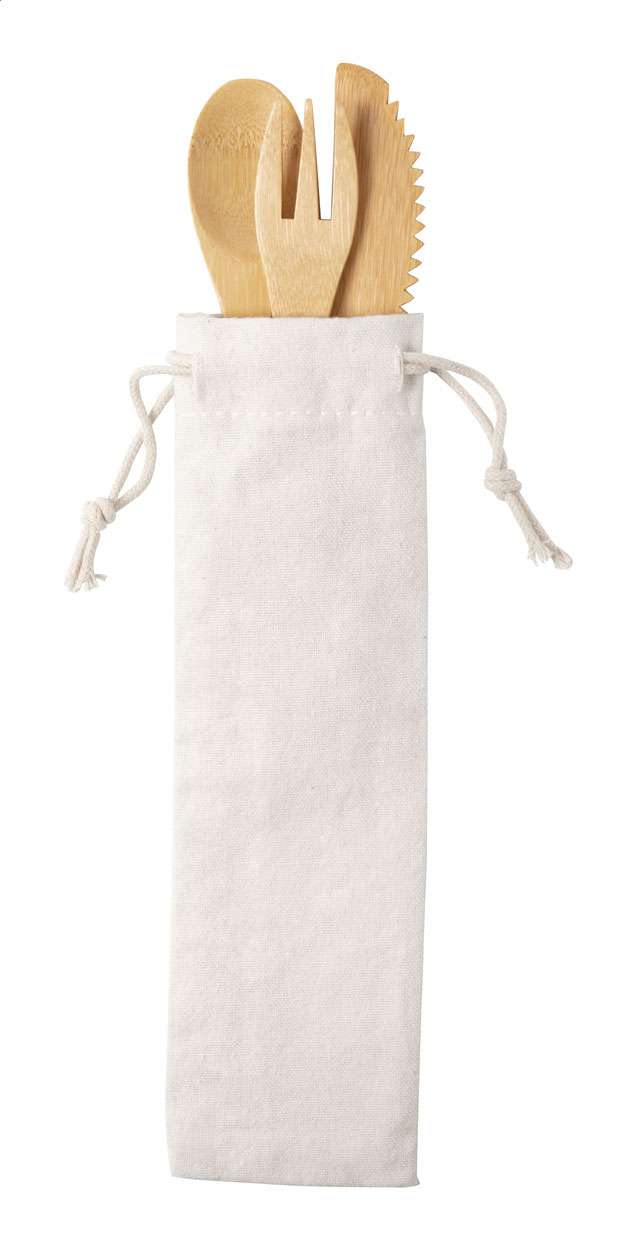 Set 3 pz di posate in bambù in sacchetto di cotone.