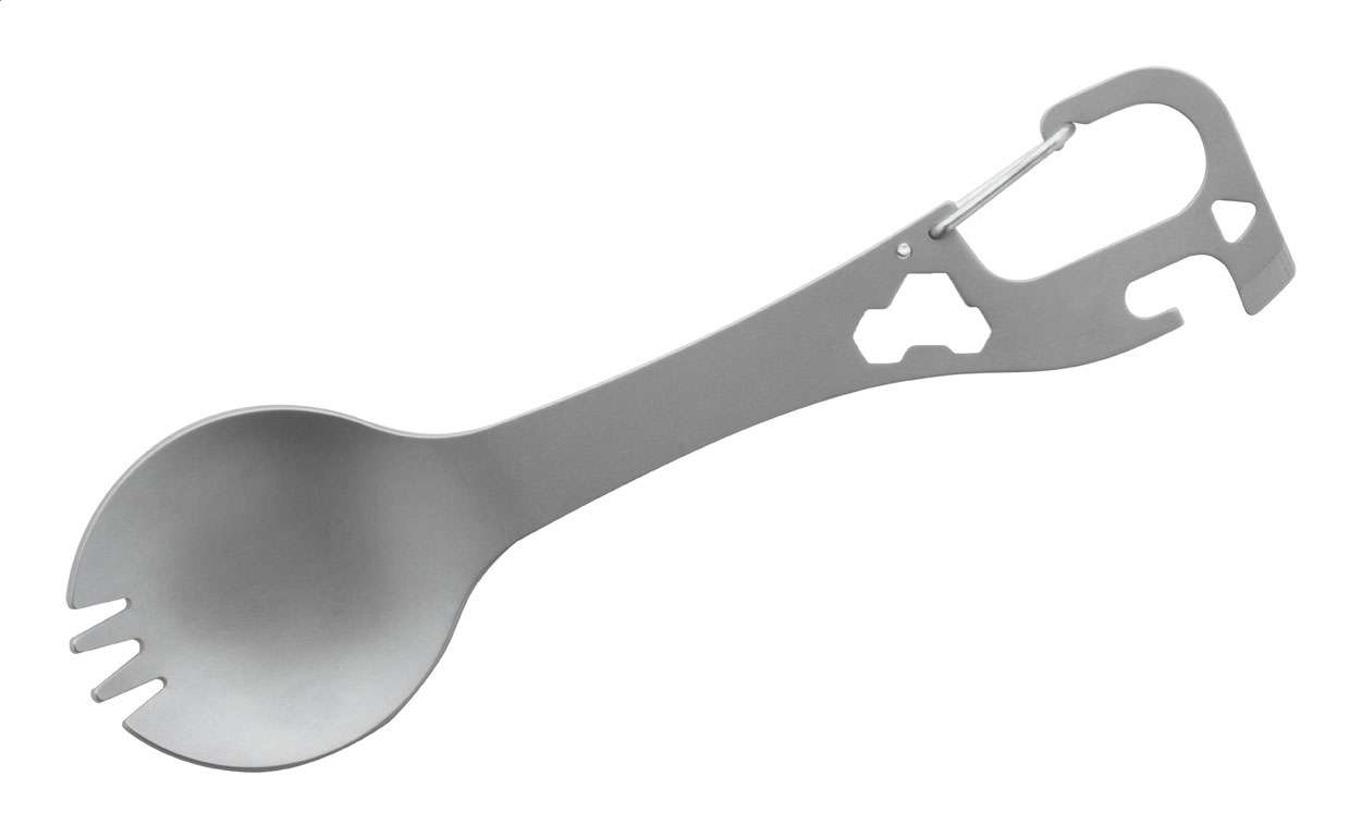 Posate (cucchiaio e forchetta) e multi-utensile in acciaio inox con moschettone.