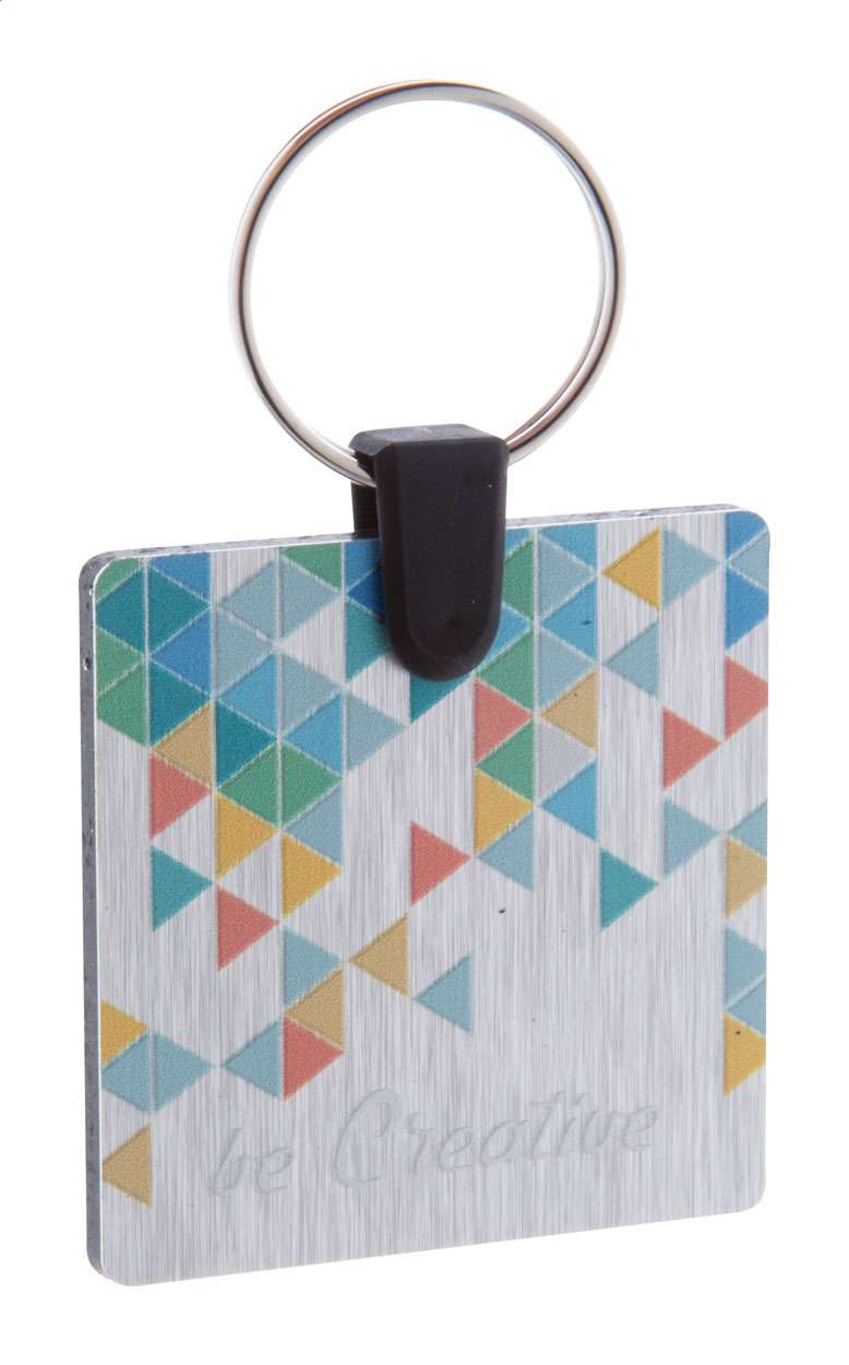 Portachiavi di forma quadrata in composito di alluminio spazzolato con stampa a colori. Il prezzo include la stampa UV LED su un lato. MOQ: 100 pz.