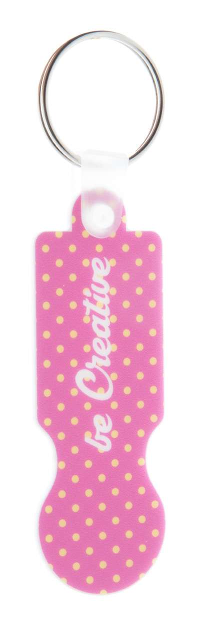 Portachiavi in plastica con inserto per carrelli della spesa e grafica a colori. Il prezzo comprende la stampa UV LED su un lato. MOQ: 200 pezzi.