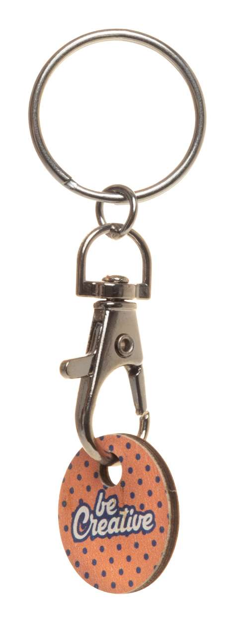 Portachiavi a moschettone in metallo con gettone in compensato per carrello della spesa personalizzabile con grafica a colori. Il costo comprende la stampa UV LED su un lato. Dimensioni della moneta: ø23×2 mm. MOQ: 200 pezzi.