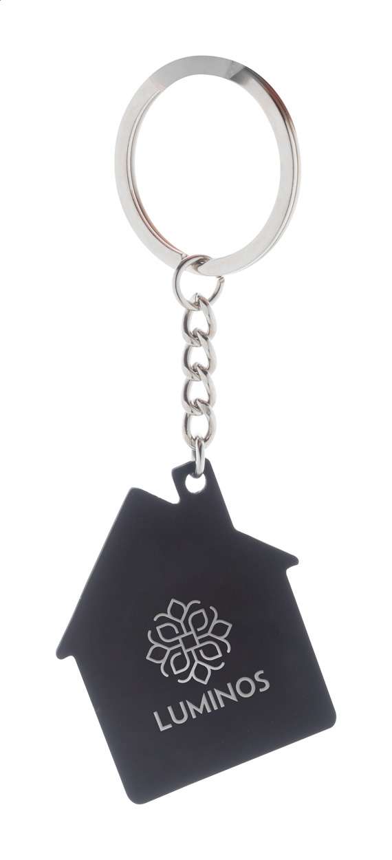 Portachiavi in acciaio riciclato a forma di casa con finitura gommata. Trattamento speciale che permette l'incisione laser a specchio.