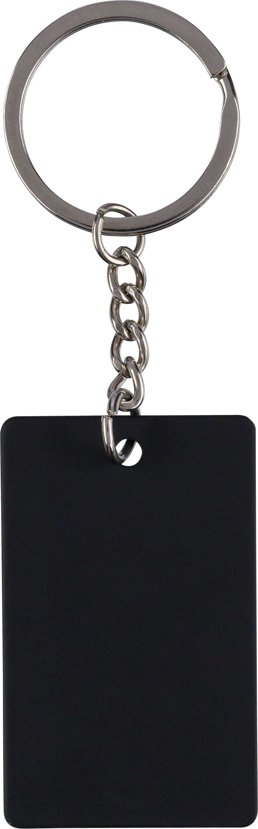 Portachiavi in acciaio inox riciclato gommato con anello metallico, design a forma rettangolare, presenta logo materiale "riciclato" inciso a contrasto su superficie lucida a specchio, confezionato singolarmente in una busta di carta kraft.