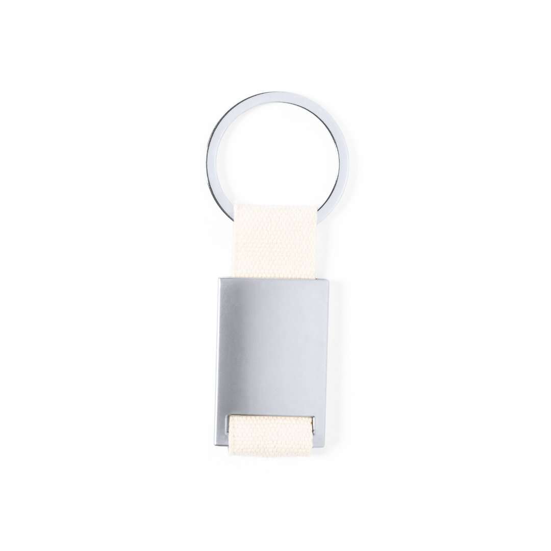 Portachiavi con corpo in metallo argentato. Nastro in cotone con finitura naturale. Ampia superficie di stampa e anello portachiavi in metallo coordinato. Confezionato in busta individuale con interno in cartone kraft.