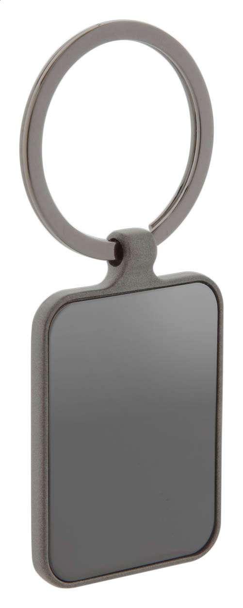 Portachiavi rettangolare in metallo con finitura canna di fucile e piastra lucida su entrambi i lati. Fornito in elegante confezione di cartoncino nero.