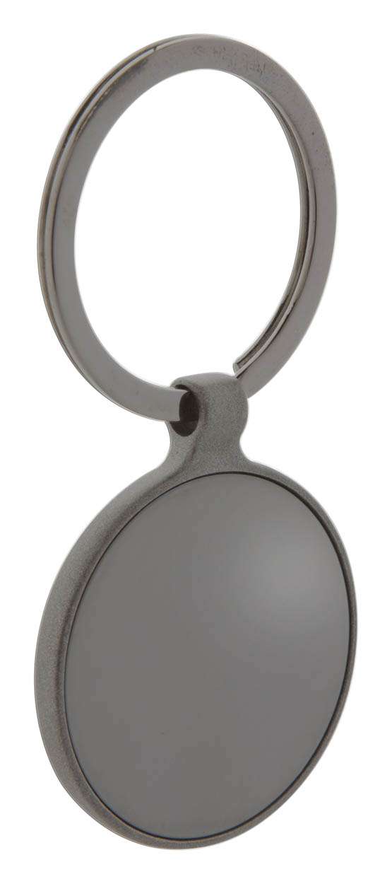 Portachiavi tondo in metallo con finitura canna di fucile e piastra lucida su entrambi i lati. Fornito in confezione regalo nera.