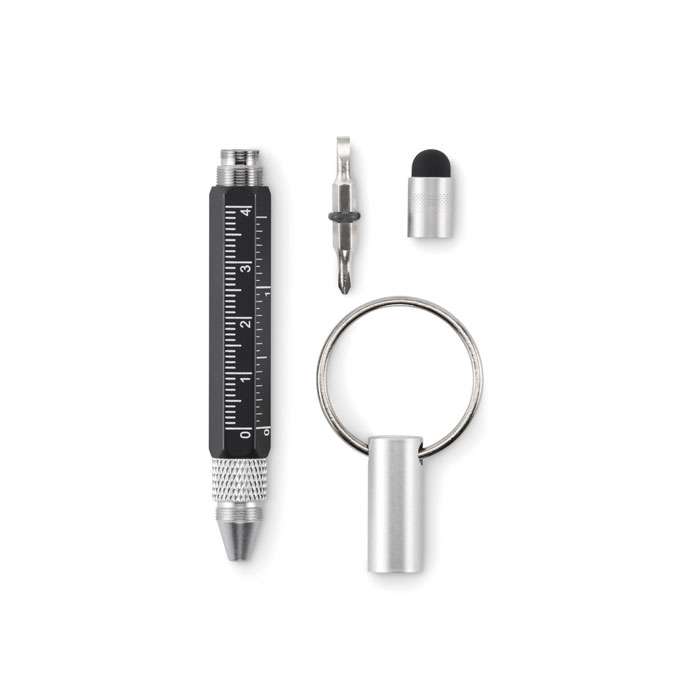 Portachiavi con penna a rotazione in alluminio riciclato con righello da 4 cm e 1,5 pollici, stilo e cacciavite 2 in 1 a testa piatta e a croce. Inchiostro nero.
