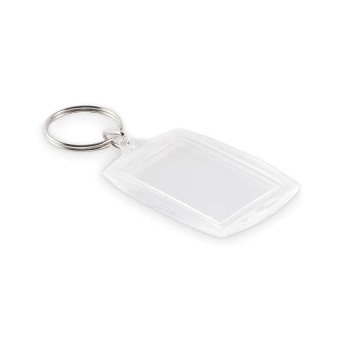 Classico portachiavi in acrilico con inserto in carta a colori. Dimensioni della foto interna: 4,1 x 2,7 cm