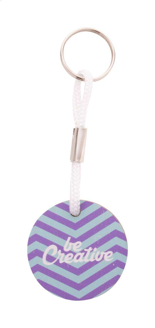 Portachiavi tondo in compensato di betulla personalizzabile con stampa a colori e cordoncino in poliestere colorato. Il costo comprende la stampa UV LED su un lato. MOQ: 200 pz.