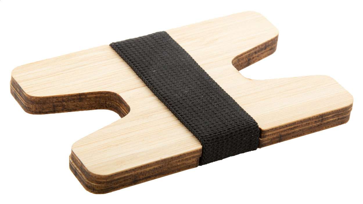 Portacarte in compensato di bambù con cinturino in gomma elastica.
