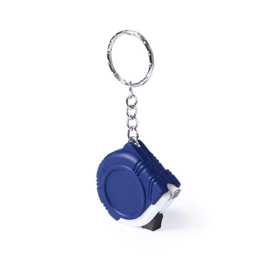 Portachiavi con flessometro da 1 metro con lama in metallo e meccanismo di bloccaggio. Misure in centimetri, pollici e piedi. Con fustellatura speciale per la marcatura.