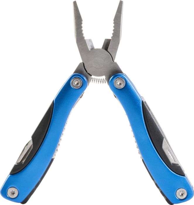 Multi tools 10 funzioni, in alluminio ed acciaio inox, dettagli in ABS, include sega, due giravite (uno piatto, l'altro a stella), lima, apribottiglie, squama-pesce, schiaccianoci e righello, in comoda custodia