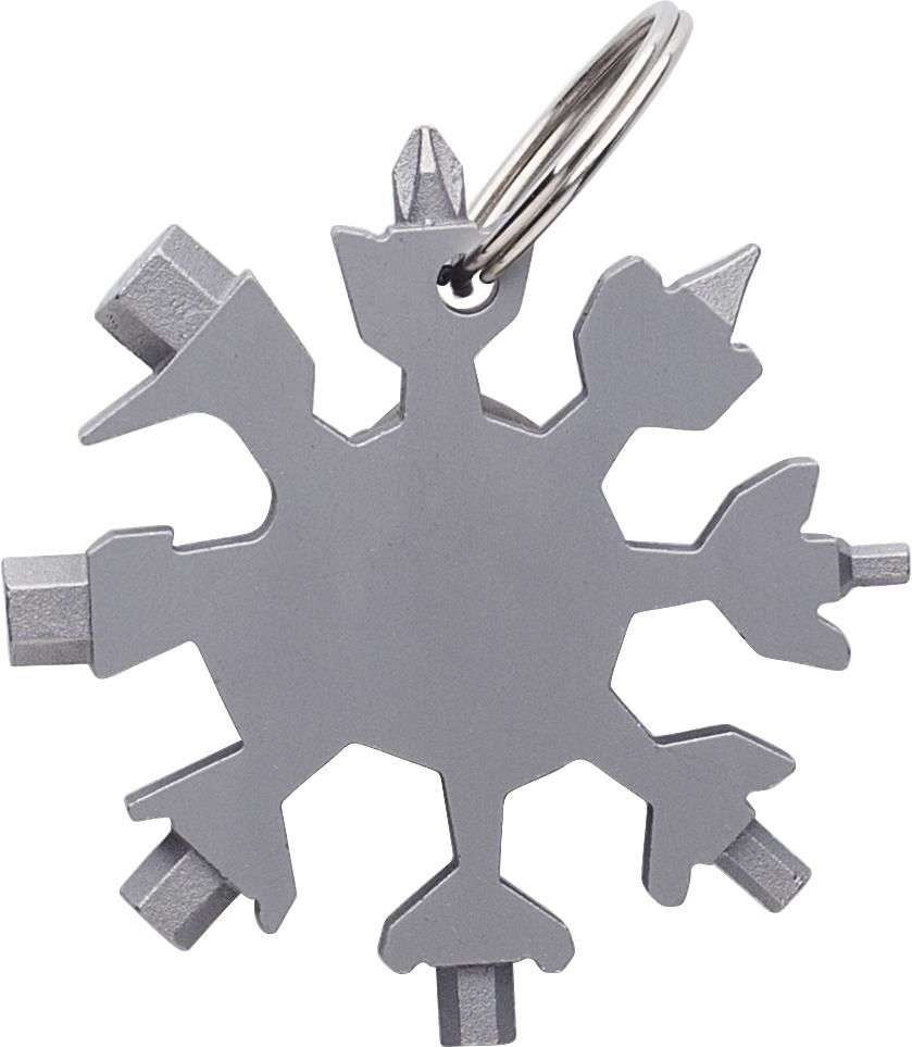 Multi tools in acciaio inossidabile 17 funzioni, forma fiocco di neve, include cacciavite a taglio, apribottiglie, chiave inglese, coltello per spago e chiavi esagonali di dimensioni multiple, portachiavi, confezionata singolarmente in una scatola in cartone avana