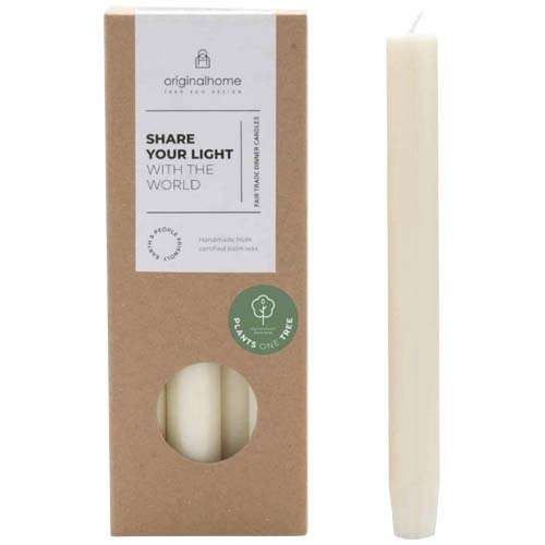 La candela Dinner Originalhome è naturale al 100% e realizzata a mano con cera realizzata dal nocciolo del frutto della palma certificata. Include 10 candele non profumate vendute in una confezione regalo. Ogni candela brucia per circa 7-8 ore.