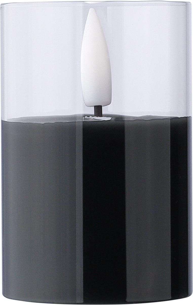 Candela LED in cera con supporto in vetro e effetto fiamma realistica, include batteria ed offre un’autonomia di circa 100 ore, progettata per uso interno, confezionata singolarmente in una scatola di cartone avana.