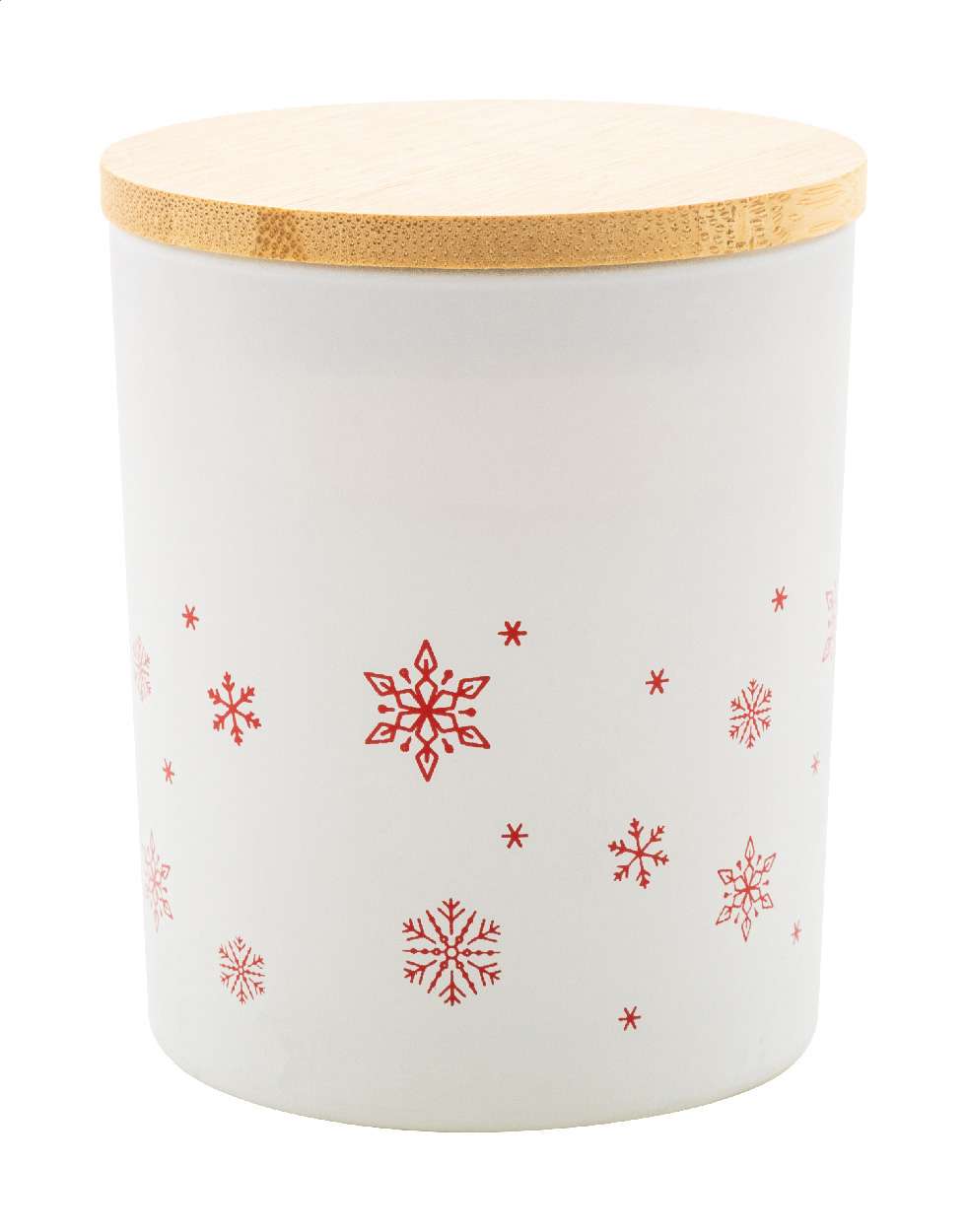 Candela in cera profumata da 120gr. a base vegetale contenuta in un contenitore di vetro smerigliato con decorazione a tema fiocco di neve natalizio e coperchio in bambù. Confezione in scatola di cartoncino kraft.