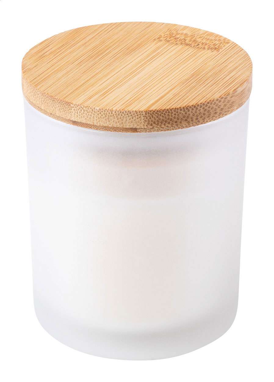 Candela profumata alla vaniglia in vaso di vetro con coperchio in bambù.