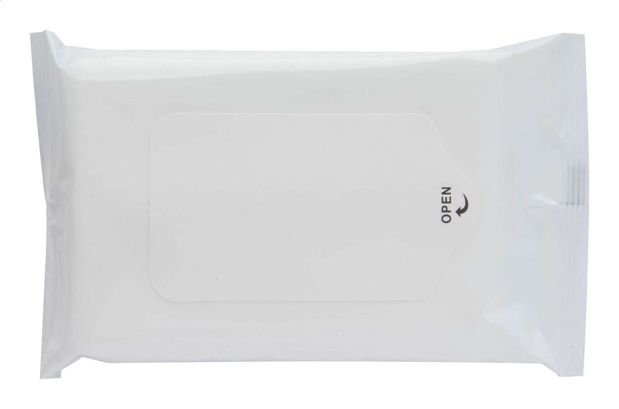 10 salviette umidificate in sacchetto risigillabile. Dimensioni delle salviette non piegate: 19×16 cm. Ideale per personalizzazione tampografica o con adesivo vinilico a colori.