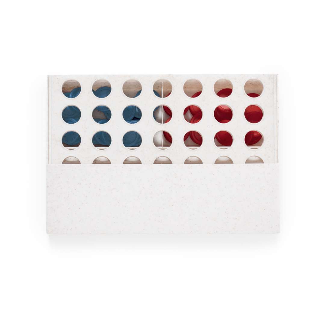 Divertente gioco da tavolo realizzato con in fibra di grano. Composto da una tavola verticale e 42 pezzi circolari (21 rossi e 21 blu). Emozione per tutte le età inserendo le fiches nelle fessure per ottenere 4 fiches nella stessa fila. Facile da montare grazie alla sua tavola mobile e può essere aperto o piegato. Presentato in una scatola dal design kraft.