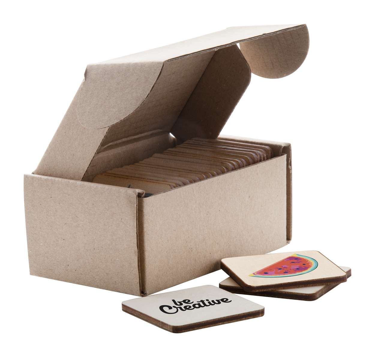 Gioco di memoria composto da 24 tessere (40x40 mm) in compensato di betulla laminato e grafica personalizzata. Il costo comprende 12 diverse stampe a colori sul lato anteriore delle tessere e una identica stampa a colori sul lato posteriore di tutte le tessere. MOQ: 250 pezzi.