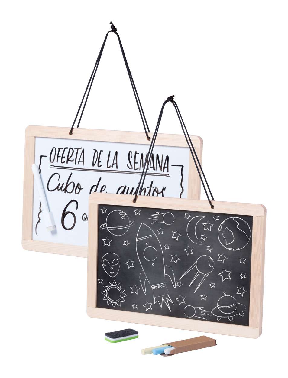 Set bacheca doppia: un lato con lavagna nera e il retro con piano scrivibile; il set comprende anche 3 gessetti, 1 pennarello ed 1 gomma.