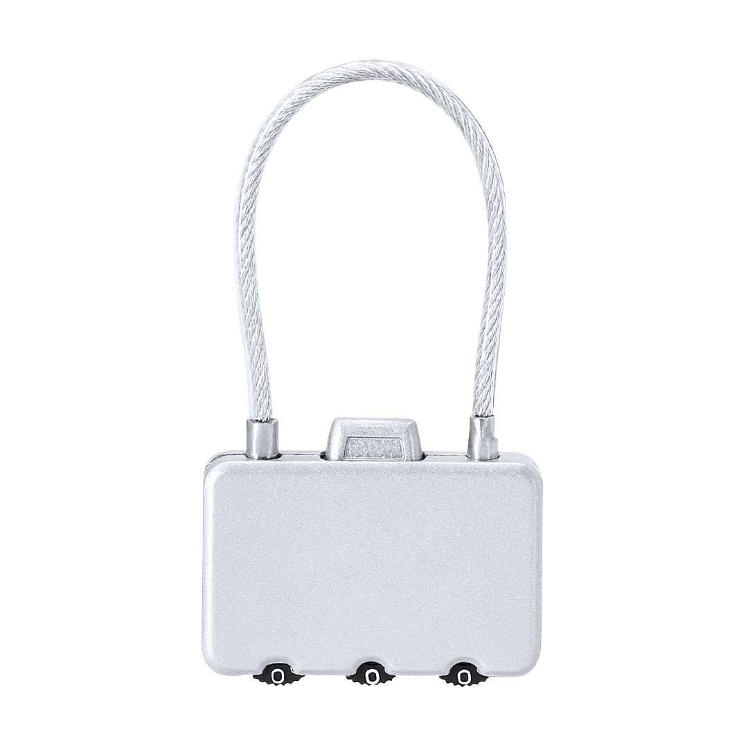 Lucchetto metallico con combinazione numerica a 3 cifre, pulsante di apertura sulla parte superiore e chiusura con cavo in acciaio.