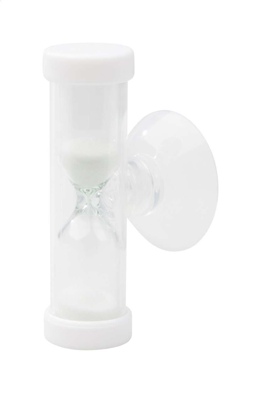 Clessidra in plastica da 3 minuti con tappo e sabbia in colore coordinato e supporto a ventosa. Personalizzala con l'inserto in carta!