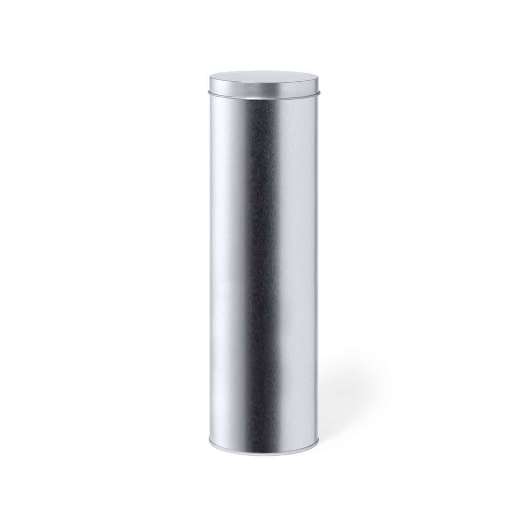 Scatola di presentazione cilindrica, in robusto metallo argentato, con coperchio coordinato.